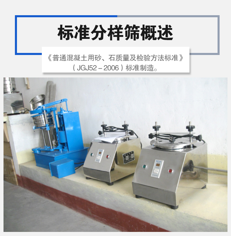 供應(yīng)標(biāo)準(zhǔn)分樣篩供應(yīng)分樣篩是按《普通混凝土用砂、石質(zhì)量及檢驗(yàn)方法標(biāo)準(zhǔn)》(JGJ52-2006),對顆粒性材料進(jìn)行篩分試驗(yàn)用的符合標(biāo)準(zhǔn)形狀和尺寸規(guī)格要求的系列樣品篩。標(biāo)準(zhǔn)篩篩孔為正方形或圓形,適用于測定碎石或卵石中的含泥量。