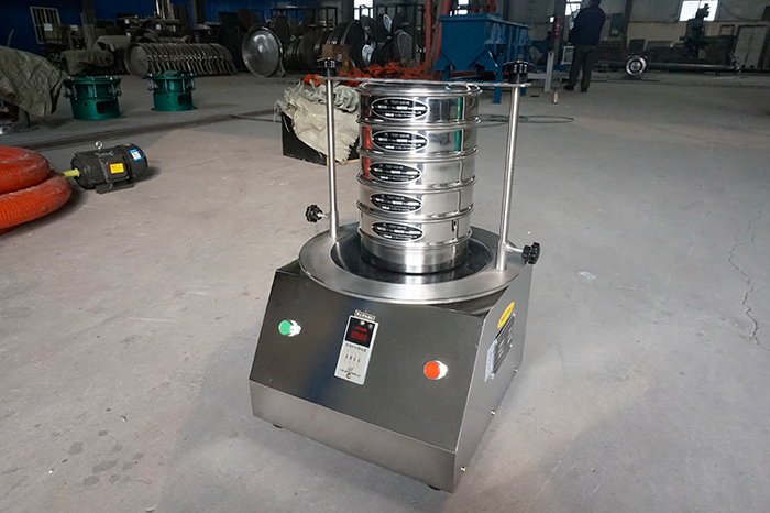 試驗(yàn)篩機(jī)是以YZU立式振動(dòng)電機(jī)作為整機(jī)振動(dòng)源,通過振動(dòng)電機(jī)帶動(dòng)上部振動(dòng)盤振動(dòng),再通過振動(dòng)盤傳導(dǎo)至安放在振動(dòng)盤上部Φ200篩框上,然后由需要檢測目數(shù)的篩框把小于篩網(wǎng)孔徑的物料顆粒篩分至下層篩框,如此層層篩選,使每層試驗(yàn)篩內(nèi)只留相同粒度的物料,達(dá)到不同粒度的分離并確定此物料的粒度組成,使Φ200型篩框中的物料能非常有效的起到過濾、分級、篩分目的。
